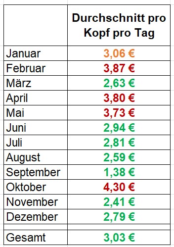 Auch habe ich die jeweiligen Kosten zusammengerechnet und die durch-schnittlichen Kosten pro Person und Tag ausgerechnet. Hier zum Beispiel vom Juli