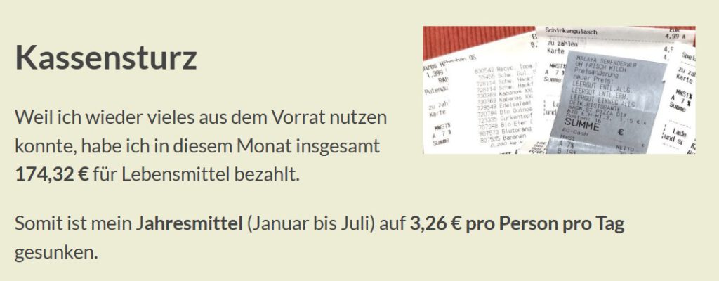 Mich interessiert noch: was ist/sind deine Motivationen für das ganz sparsame Hauswirtschaften? Ist es ein begrenztes Budget, ist es Frust über hohe Preise oder ist es vielleicht auch ein bisschen ein Spiel, die Ausgaben immer noch ein wenig reduzieren zu können und zu sehen, das zu schaffen oder noch weitere Gründe? Ist eine ganz offene Frage, die ich mir auch immer wieder stelle.