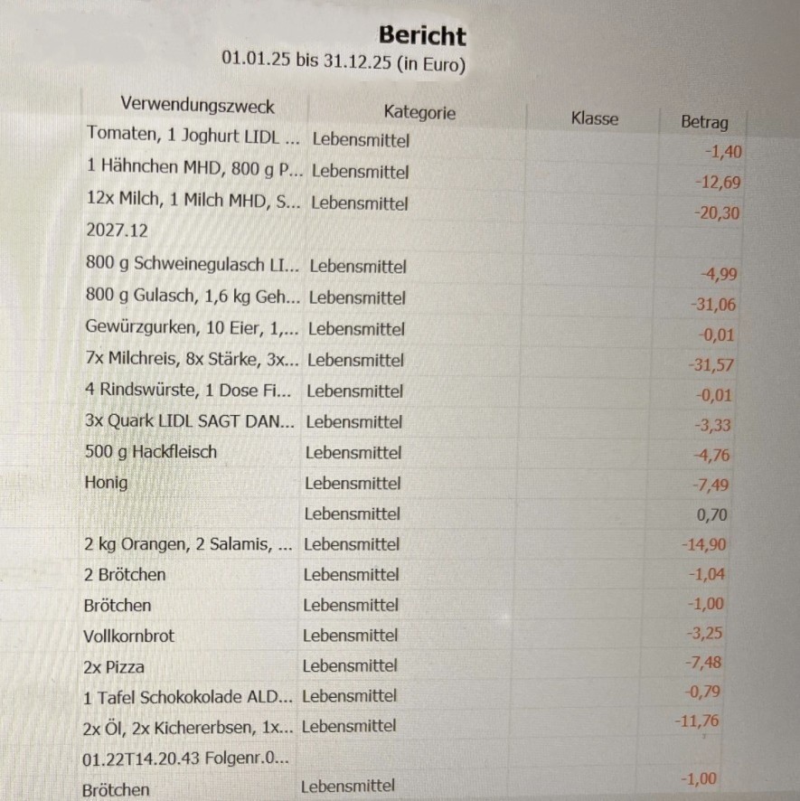 Das Einkaufen und die Rechnerei ist hier Männersache. Für das kommende Jahr habe ich nun angeregt, mal mehr ins Detail zu gehen und nur die Lebensmittel zu erfassen.