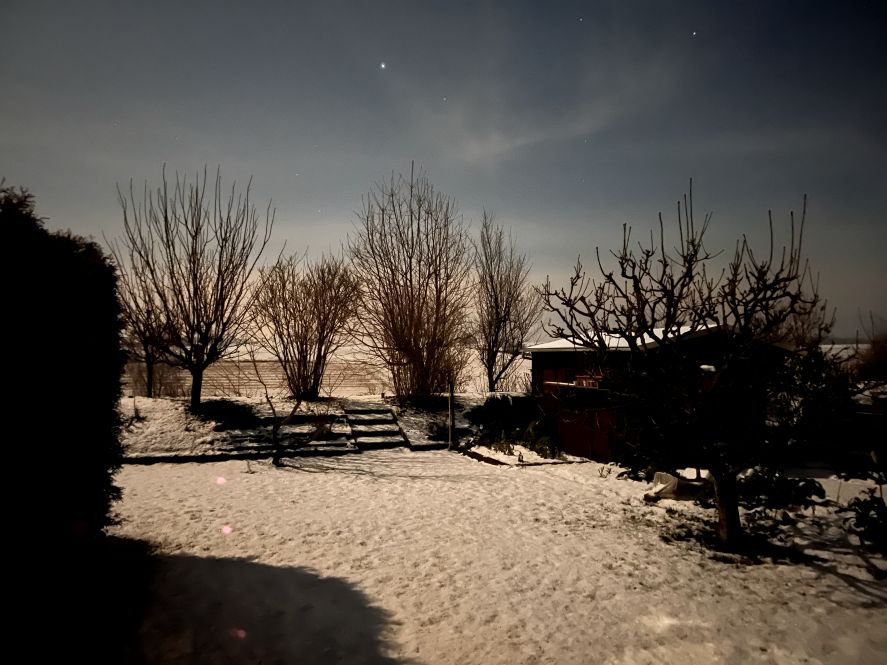 In der Nacht von Montag auf Dienstag war es bei Fast-Vollmond so hell, dass ich mit meinem Handy solche Fotos machen konnte. Man sieht, wie der Mond den Schatten der Bäume in den Schnee wirft und oben ein paar Sterne funkeln. Ich stand beistimmt eine viertel Stunde an Fenster – so hat mich hat der Anblick begeistert. Es war zwar hell, aber wiederum nicht so hell wie am Tag. Details nimmt man in diesem Licht ganz anders wahr.