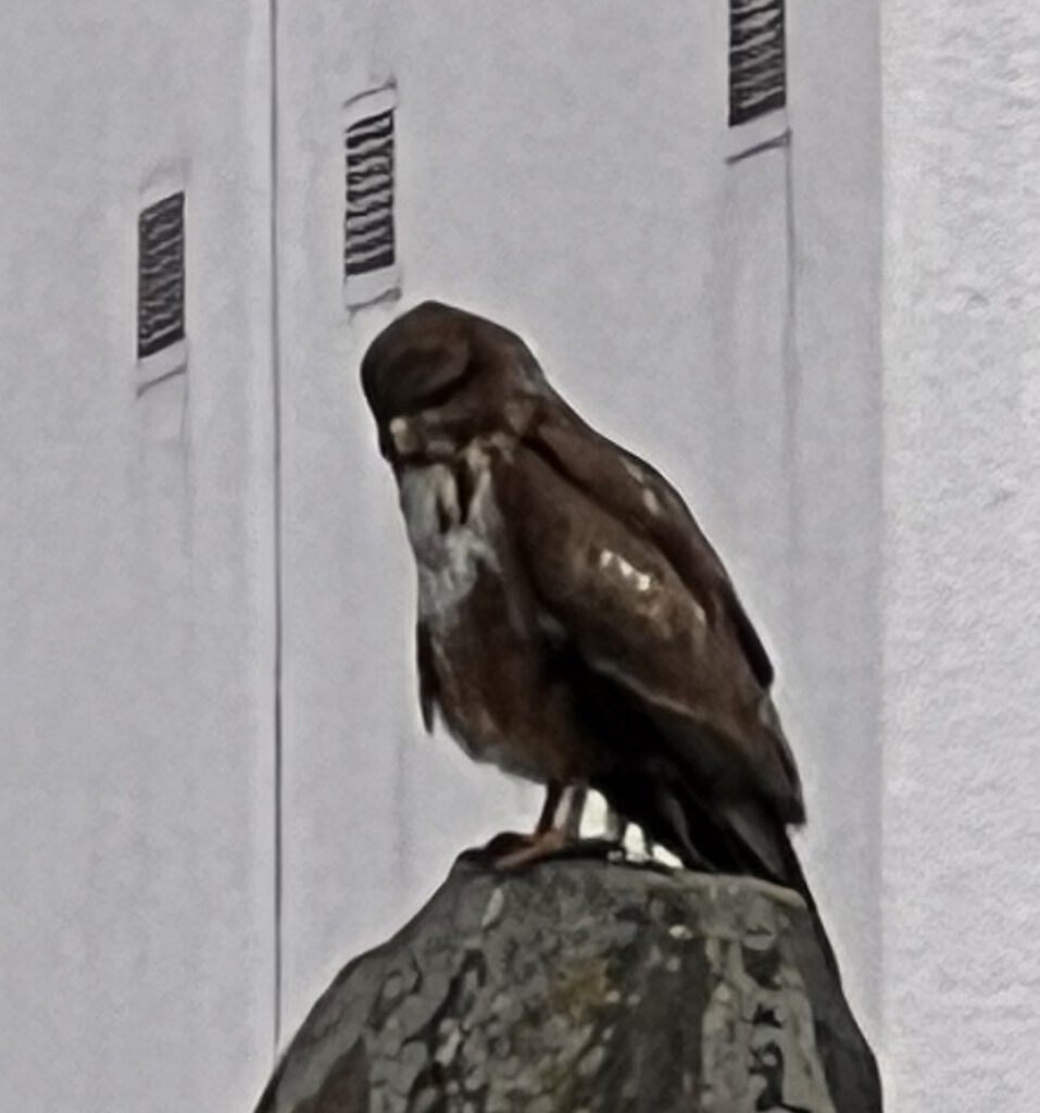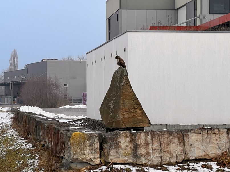 Im Gewerbegebiet saß ein Mäusebussard und hat sich nicht von dem Treiben der Leute auf dem Hof der Werkstatt stören lassen.