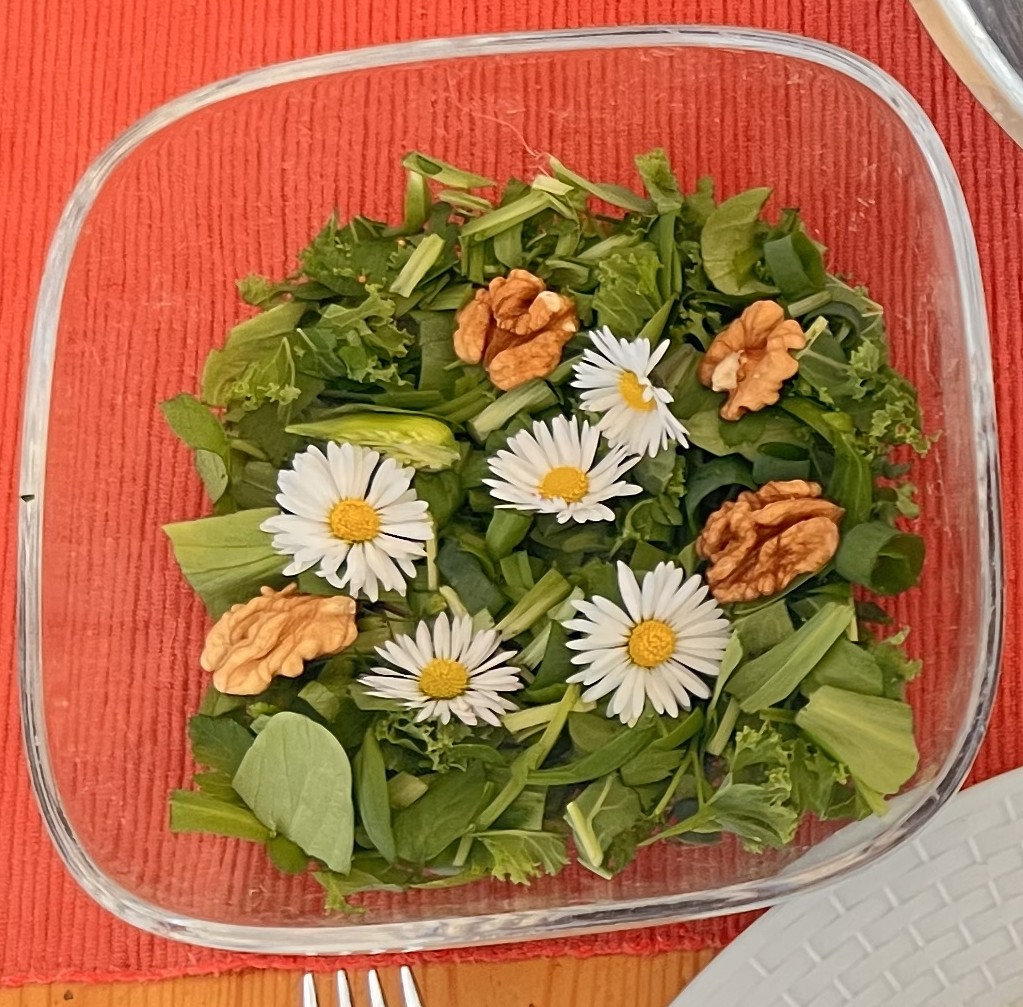 Für Salat wird die Auswahl jetzt wieder größer. Irgendwelche Kräutlein und Blättchen finde ich immer. Etwas Feldsalat wächst auch immer noch nach.