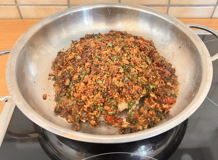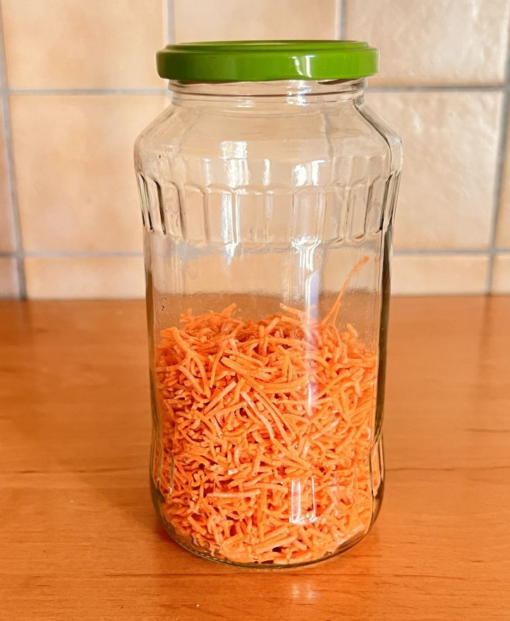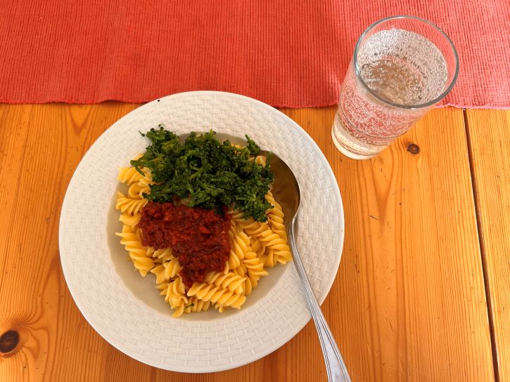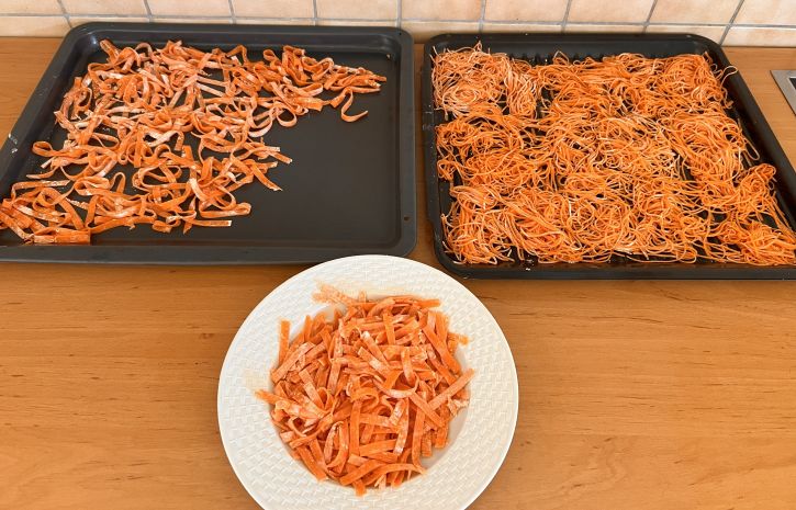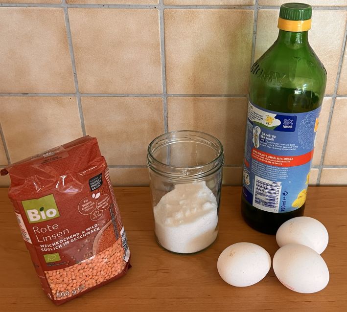 Aus roten Linsen und Ei habe ich Nudeln für gemacht. Einen Teil haben wir gleich gegessen, einen anderen Teil habe ich getrocknet und im Vorratsschrank verstaut.