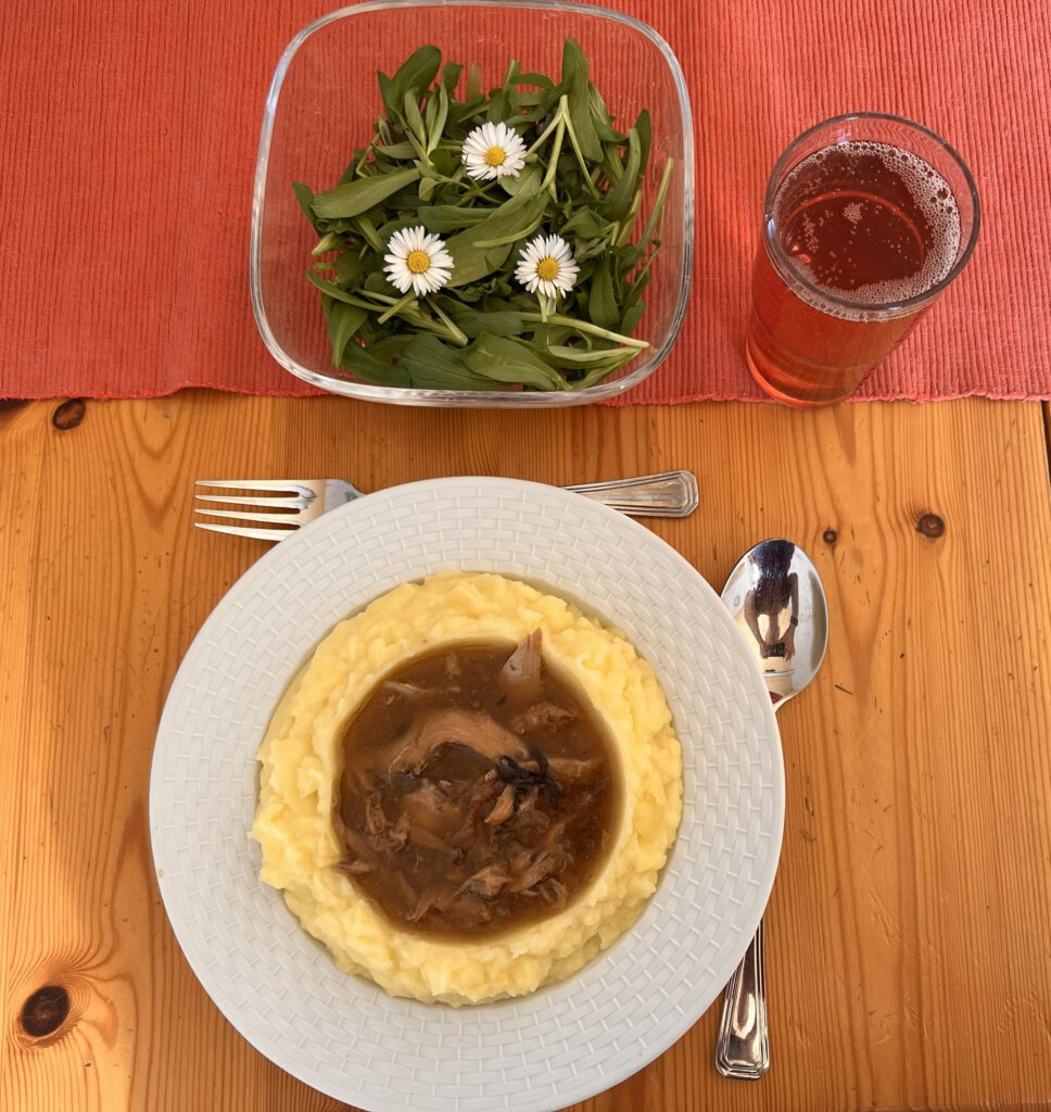 Kartoffelbrei mit Entenrest vom Weihnachtsessen, dazu Salat „quer durch den Garten“