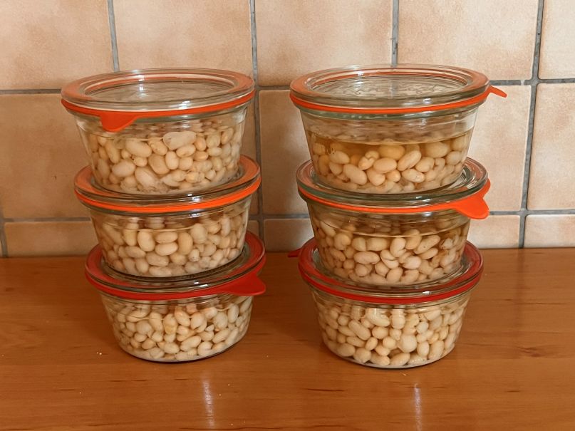 Weiße Bohnen. Erst eingeweicht, dann gar gekocht und dann mit etwas Salz und Kochwasser in Portionen eingekocht.