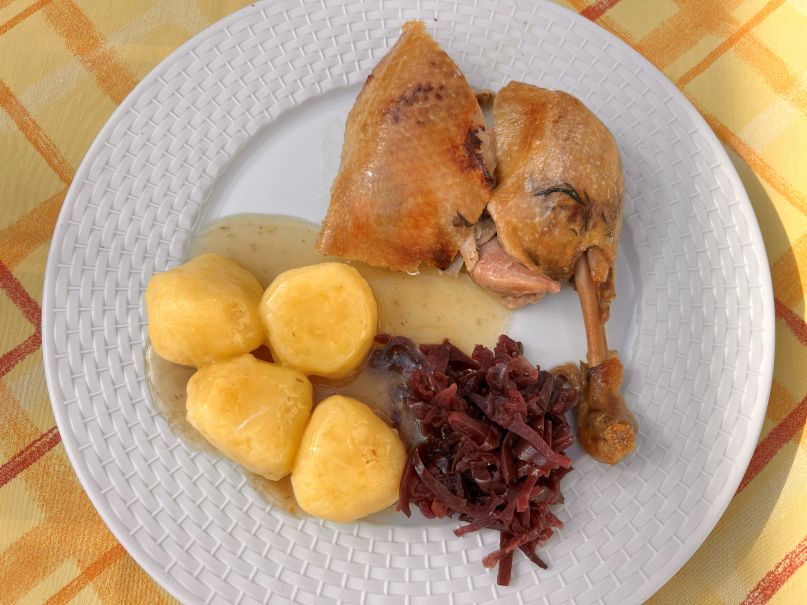 Entenbraten von der Ente, die ich vor Weihnachten gekauft hatte und die seither im Frost lag. Dazu Rotkohl und Klöße.