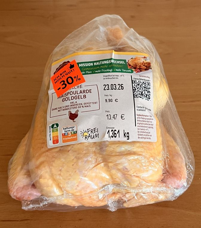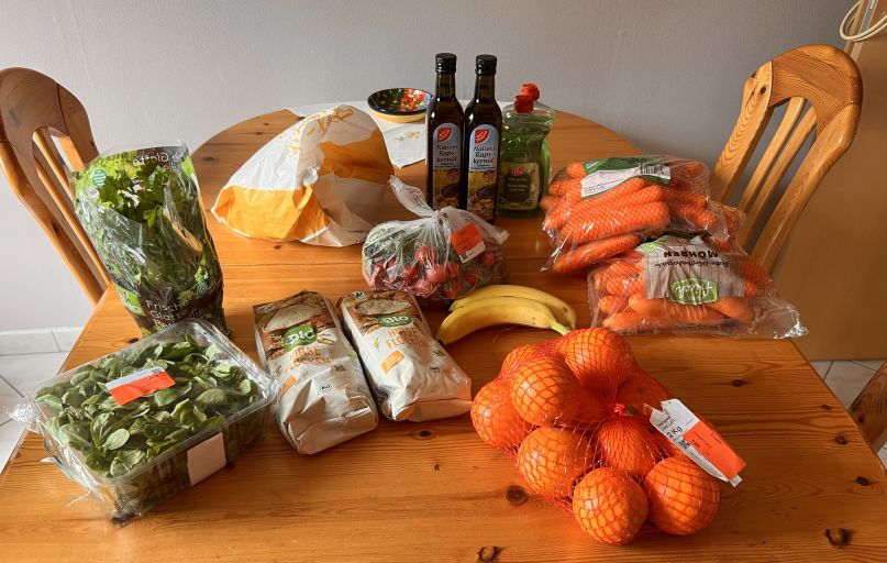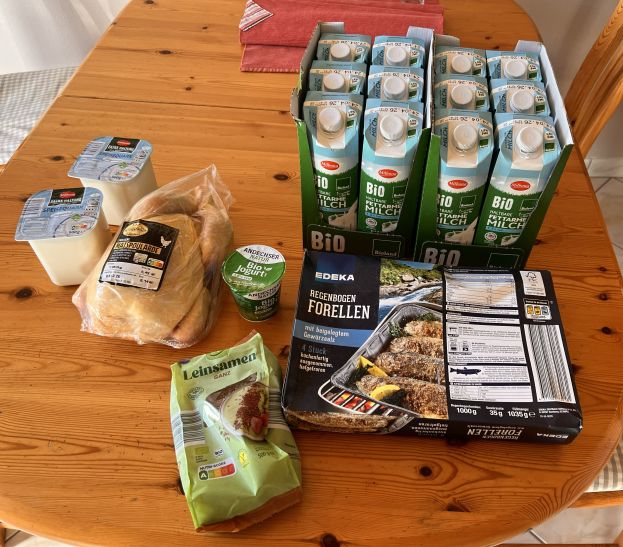 Ich habe einige meiner Vorräte nachfüllen und nachkaufen müssen/wollen. Hülsenfrüchte, Öl, Roggenmehl (im Angebot), verschiedene Reissorten, Zahnpasta, Geschirrspülmittel, 1x ! Toilettenpapier, Kartoffeln, Milch, 1 zusätzliches Huhn und Möhren.