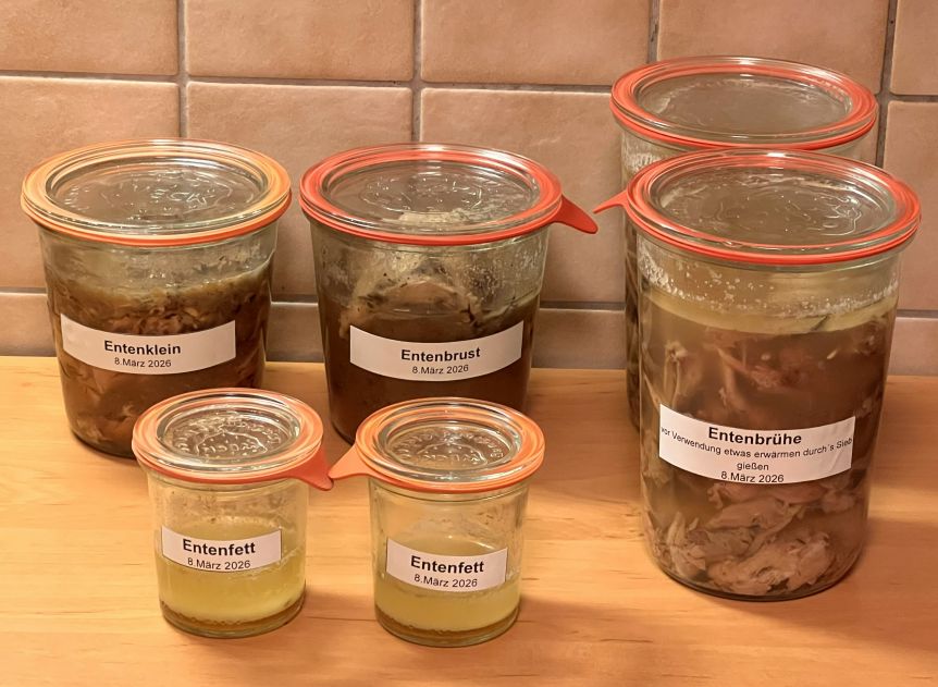 Die „Reste“ vom Entenbraten, den ich jetzt frisch gemacht hatte. Das ist ein Glas mit Entenbrust in Soße, ein Glas mit Entenklein mit viel Soße zu Kartoffelbrei, drei Gläser Brühe jeweils eins als Grundlage für eine Suppe und 2 kleinen Gläser mit Entenfett zum Braten beispielsweise für Bratkartoffeln.