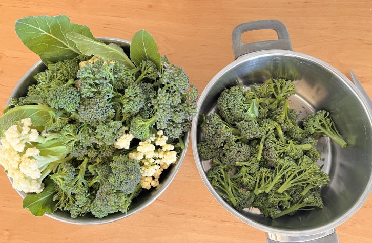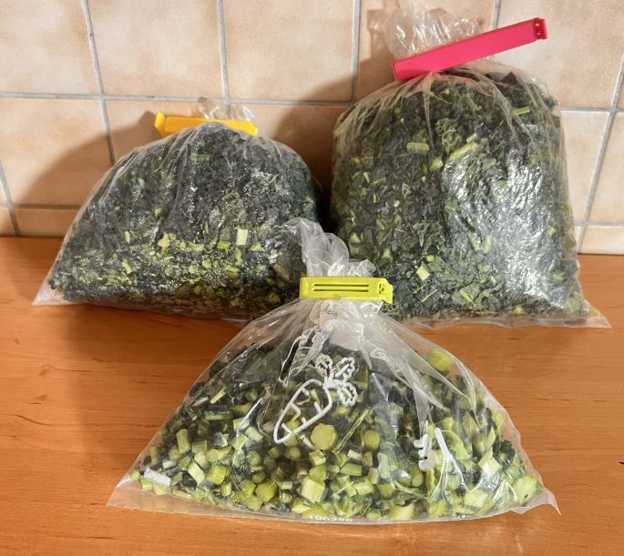 Brokkoli kann ich noch laufend nach ernten. Das hat für 3 Portionen Suppe und einen großen Beutel für den Vorrat im Tiefkühlschrank gereicht. Blumenkohl war auch eine kleine Ernte.