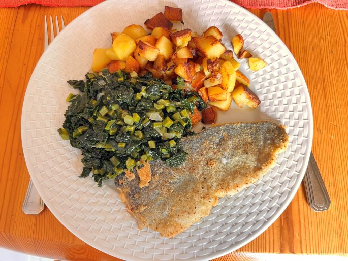 Forellenfilet mit Federkohl aus dem Garten und Bratkartoffeln