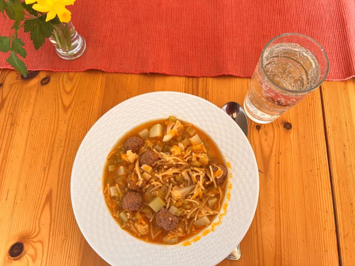 Fleischklößchensuppe mit Linsennudeln und süßen Quark (einmal verpackt zum Mitnehmen)