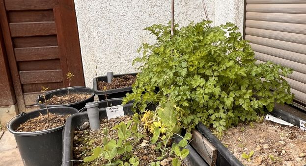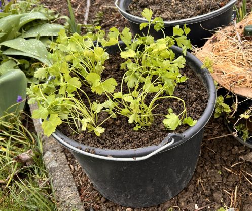 Die Petersilie im Topf, die ich für 40 ct bekommen habe, habe ich in vier Teile geteilt und in einen Eimer mit Wasserspeicher gepflanzt. Sie wird mich hoffentlich bis ins nächste Frühjahr begleiten.