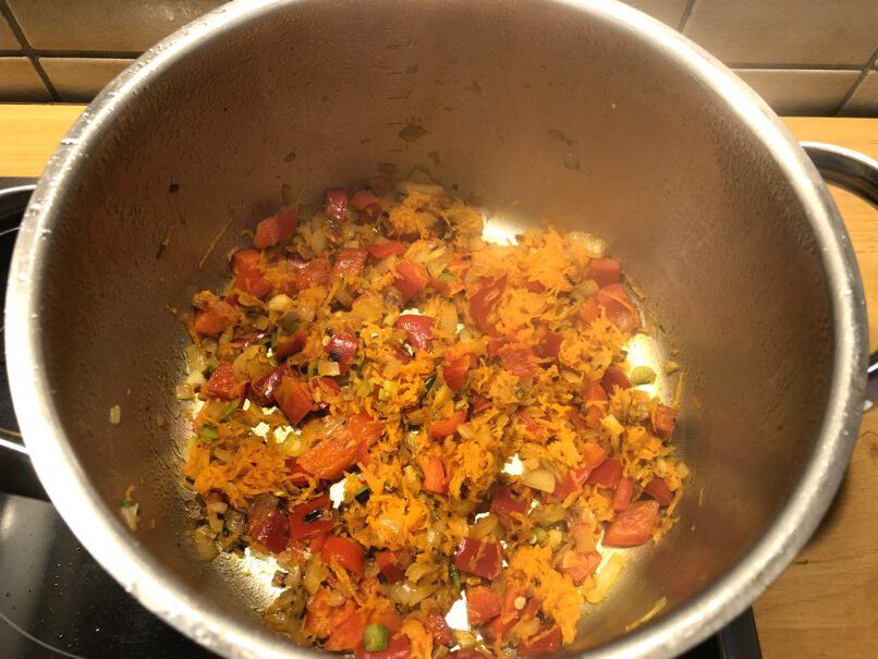 - Möhren und Paprika im gleichen Topf mit anschwitzen