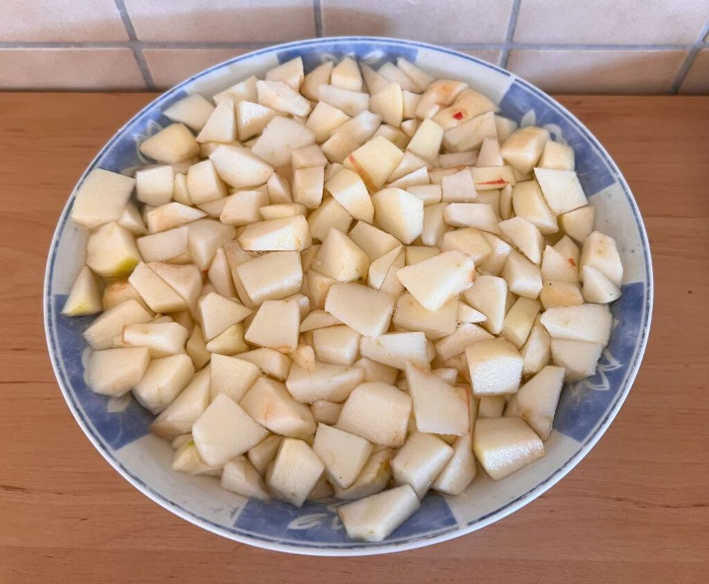 - 500 bis 600 g geschälte Äpfel, in 1×1 cm große Würfel geschnitten