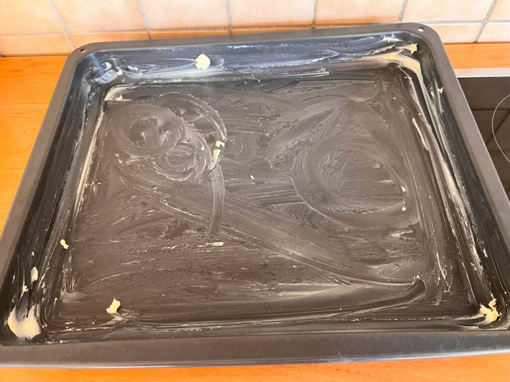 Bevor ich den Teig rühre, fette ich das Blech ordentlich mit Butter ein. Backpapier oder sogar Backspray braucht es nicht. Das sind Einwegartikel, die man sich, der Natur und seinem Geldbeutel (er)sparen kann.