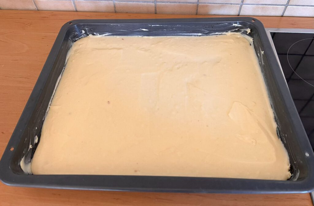 Die Hälfte des Teigs gebe ich auf das Blech, …