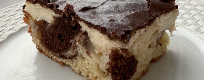 Während der Kuchen backt, kocht man geschwind einen Pudding aus 500 ml Milch, 50 g Maisstärke und 30 g Zucker und lässt ihn auf etwa Zimmertemperatur abkühlen.