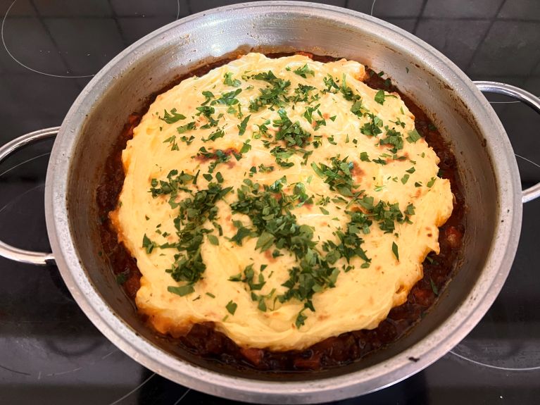 Meine Pfanne hält den Backofen aus, also habe ich direkt den vorbereiteten Kartoffelbrei auf dem Ragout verteilt und alles im Backofen bei 175°C gebacken, bis die Oberfläche Farbe annimmt.