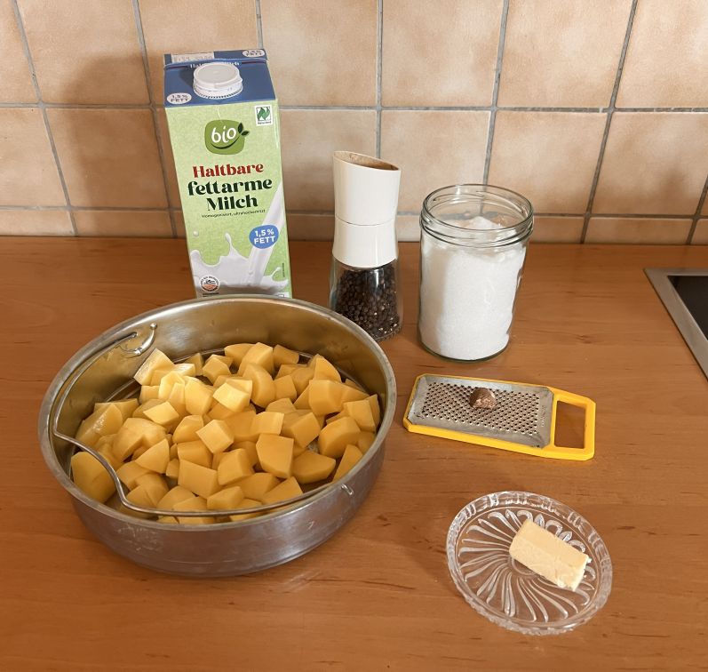 Aus Kartoffeln, Milch und Butter, Salz und etwas Muskat bereitet man einen cremigen Kartoffelbrei zu.