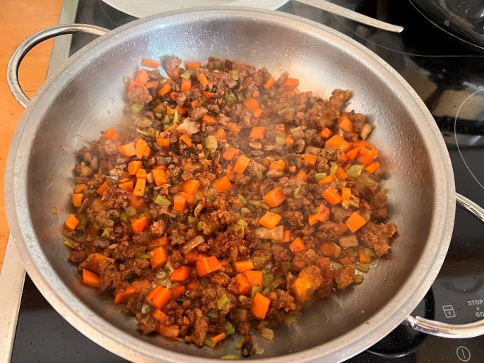 Mein Ragout war eher gemüselastig mit nur wenig angebratenem Hackfleisch zubereitet.
