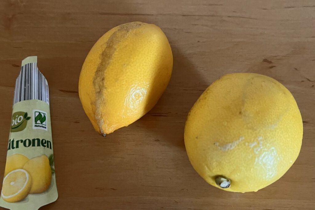 - 2 Zitronen, die keine andere Verwendung gefunden haben. Natürlich kam die gelbe Schale in Zucker. Die kann ich zum Kuchenbacken gebrauchen.