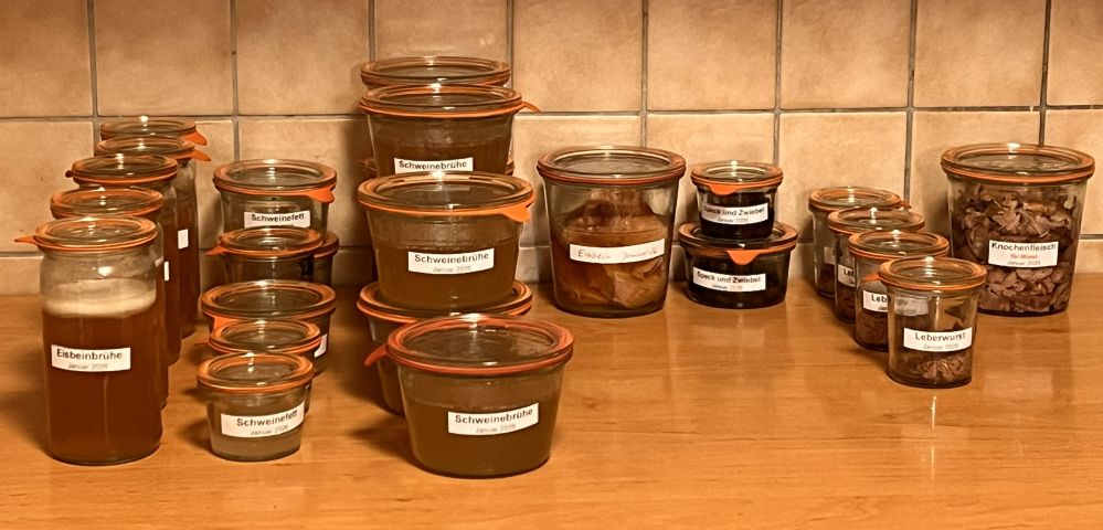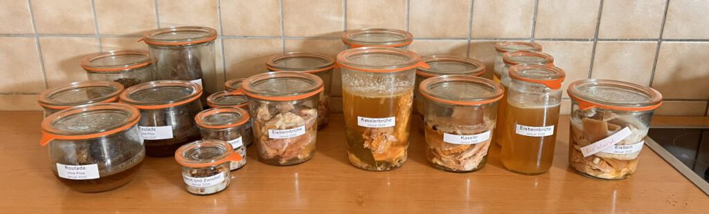- 6 Portionen Eisbeinfleisch, z.B. zu Sauerkraut. Eisbeinbrühe, die ich als Grundlage für Suppen nutze.