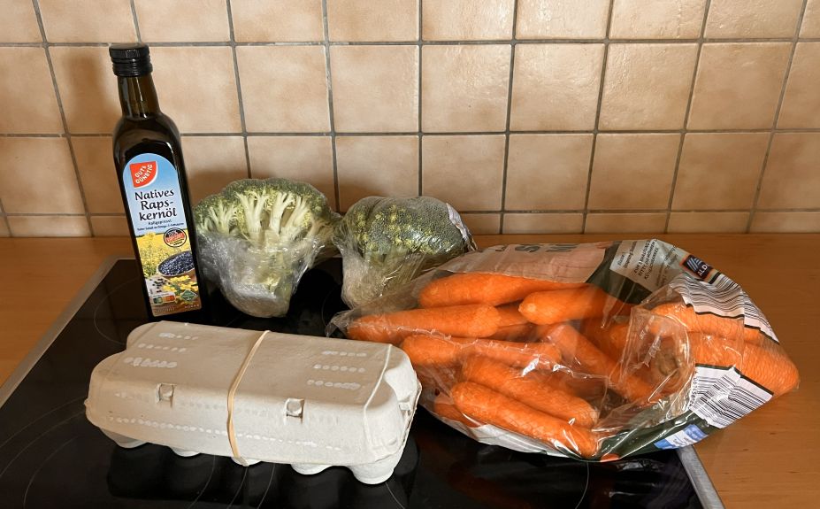 Als ich zur Post musste, haben ich den Einkauf mit den 2 kg Möhren, Öl und Eiern und dem Brokkoli gemacht
