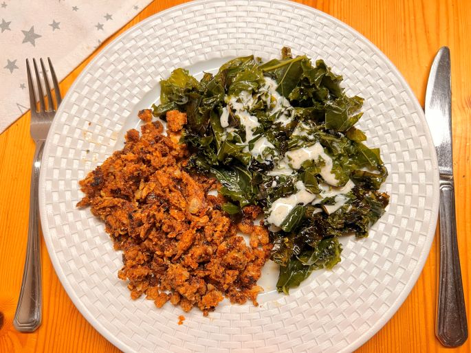 - ein Abendessen: Rote Bohnen gebraten wie Hackfleisch und dazu Grünkohl aus der Pfanne mit etwas gut gewürzter Joghurtsoße.