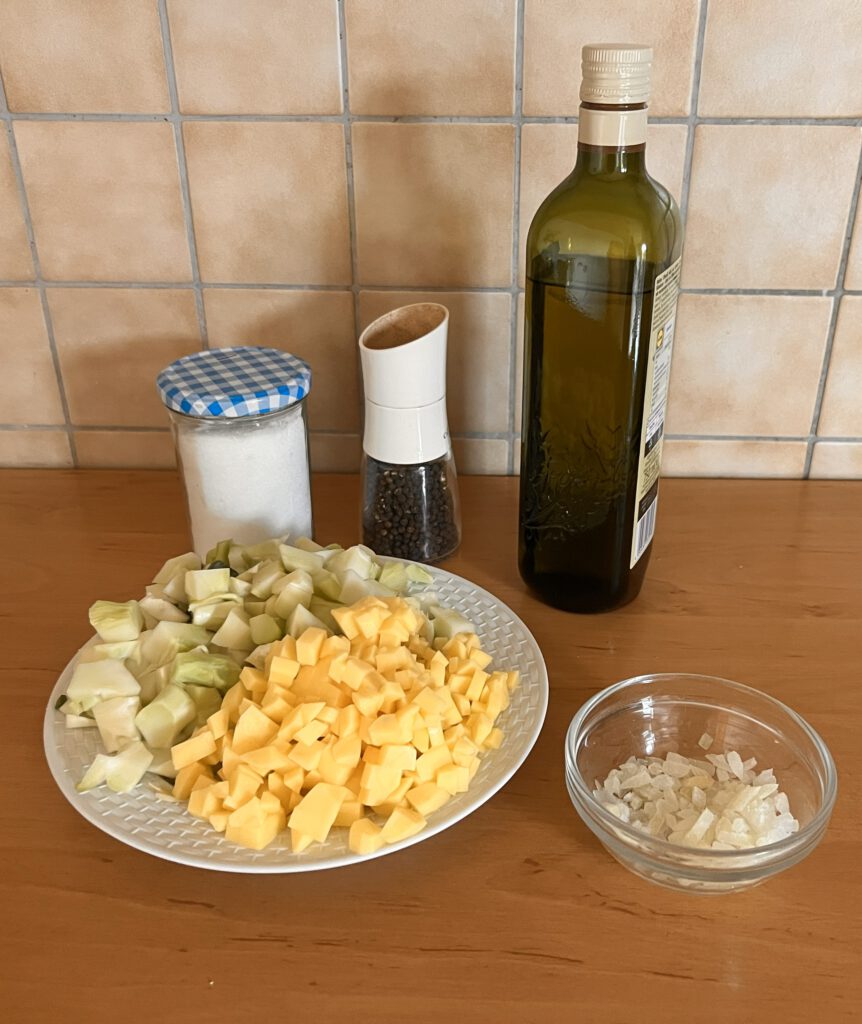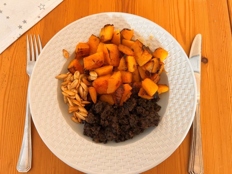 - noch ein Abendessen: gebratener Kürbis, mit seinen gerösteten Kürbiskernen. Dazu schwarze Linsen als Eiweißquelle. Die hatte ich noch in Frost.