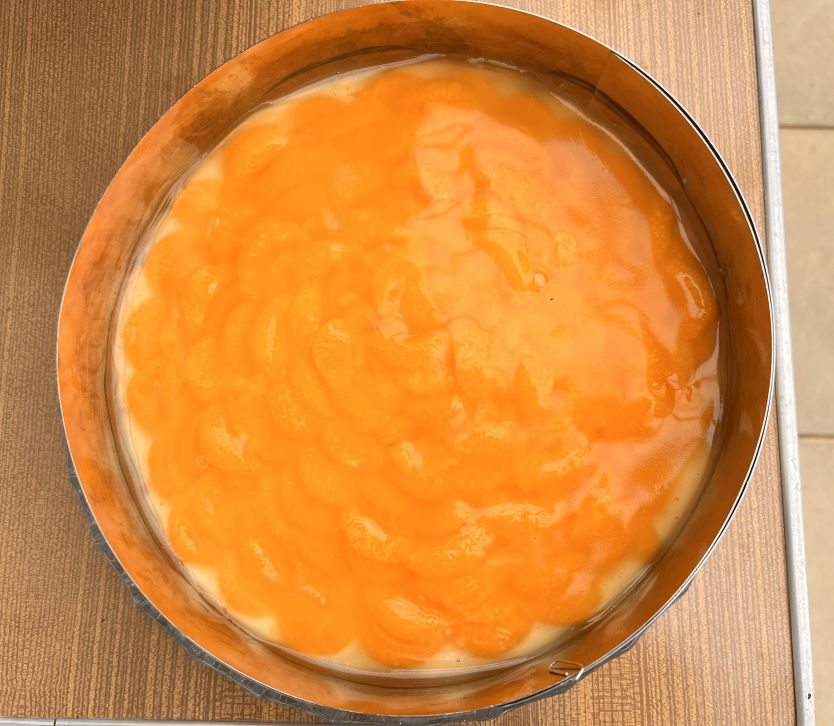 und eine Mandarinentorte aus 3 Dosen Mandarinen aus dem Vorrat, die verbraucht werden mussten, bevor das Verfallsdatum abläuft.