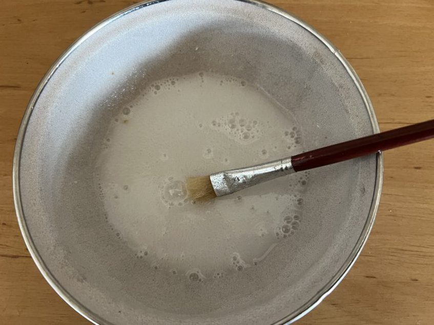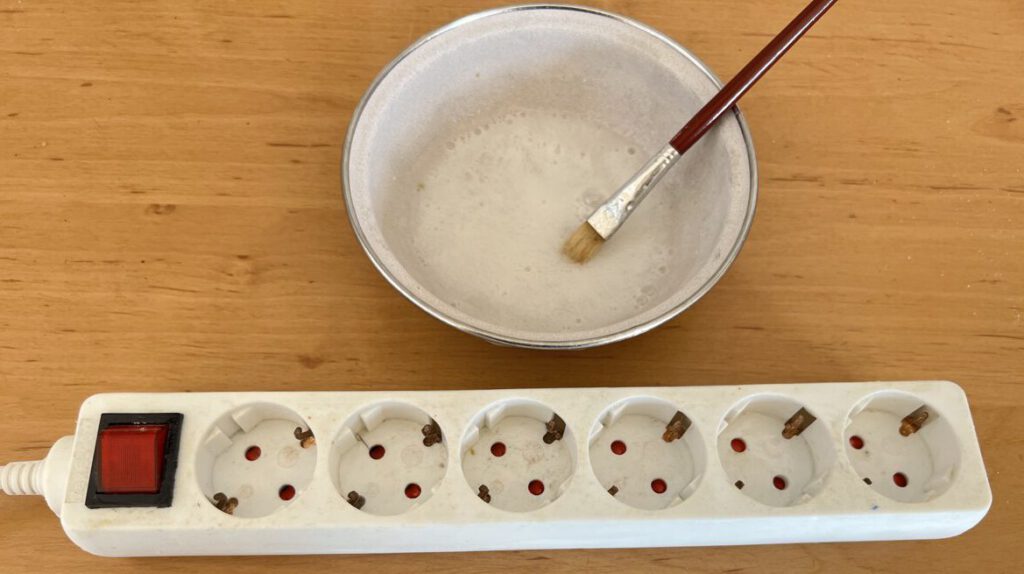Damit werden auch Steckdosenleisten wieder sauber. Ich streiche diese Waschsodamischung mit dem Pinsel auf die Flächen der Dose. Dabei achte ich darauf, dass nichts IN die Steckdosen läuft. Nach ein paar Stunden kann man die Putzmittelmischung und den Schmutz mit einem feuchten Tuch abputzen.