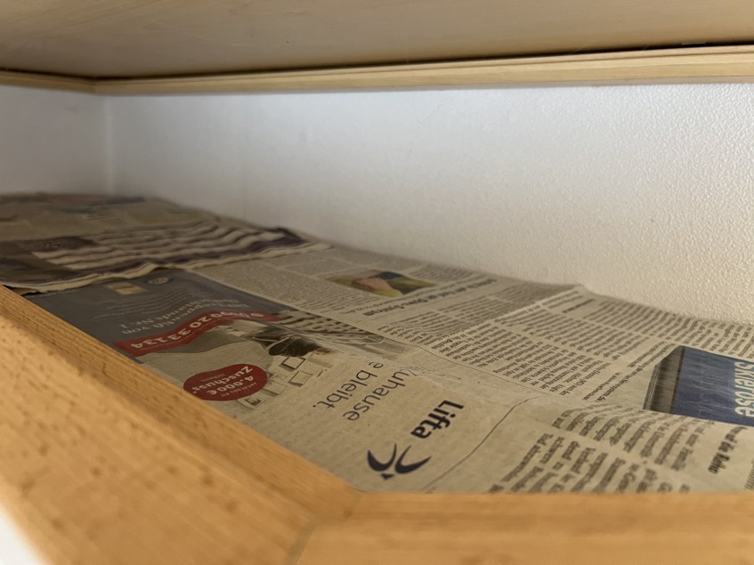 Auf den Schränken habe ich immer Zeitungspapier liegen. Das Erspart mir das Putzen dort. Ich ersetze lediglich das Papier und putze die Kranzleisten.