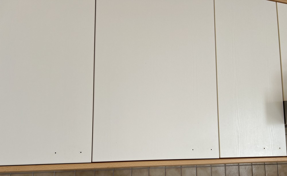 Anschließend habe ich alle Griffe abgeschraubt, damit ich eine glatte Fläche zum Putzen habe. Die Griff kamen gleich in eine Seifenlauge, das spart Zeit. Später muss ich sie (fast) nur noch abspülen und trocken reiben.