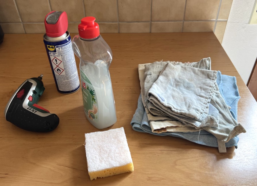 Anschließend habe ich den Schrank, bzw. das Schubfach ausgewaschen, Scharniere von Türen und Rollen von Schubladen gefettet. Wenn nötig habe ich die Schrauben von Scharnieren fest gezogen.