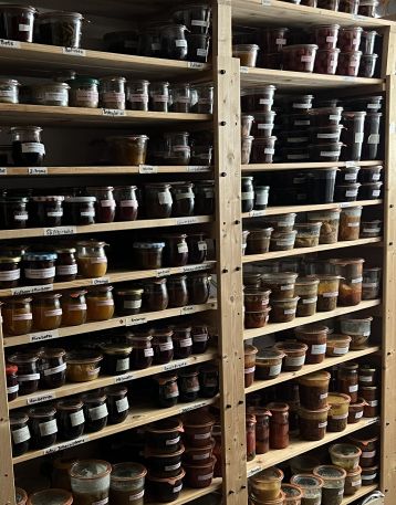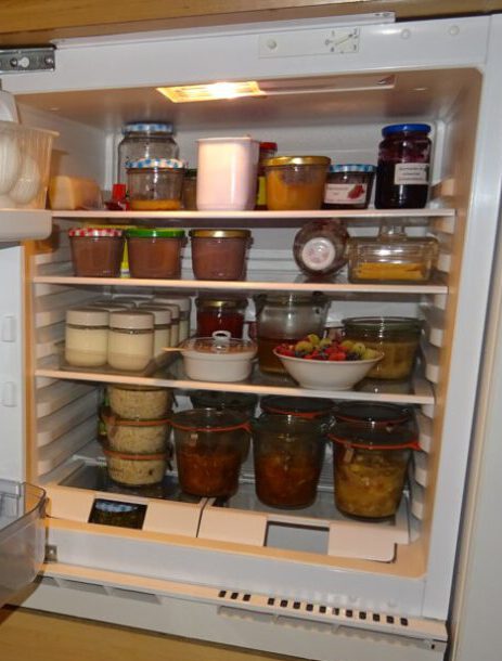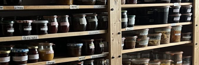 Diesen Vorrat habe ich nach und nach aufgebaut. Die Gläser rotieren, das heißt, ich koche kontinuierlich Vorrat nach und verbrauche kontinuierlich. Diese Art Vorratshaltung gibt mir die Freiheit, nicht jeden Tag von Grund auf kochen zu müssen, aber trotzdem immer selbstgekochtes Essen auf den Tisch stellen zu können.