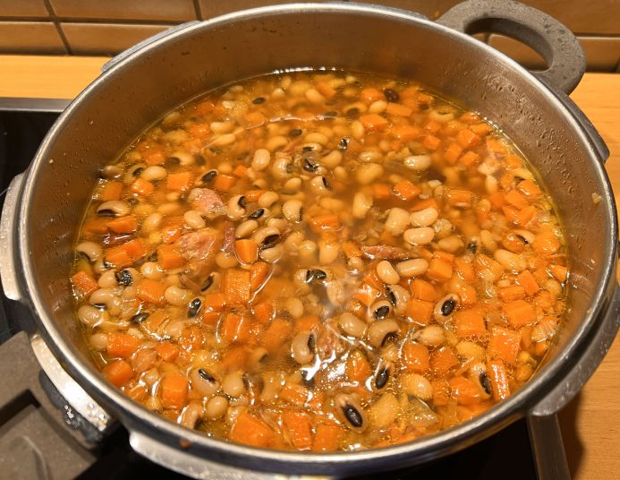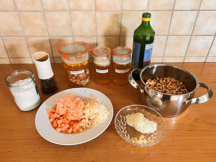 Eben habe ich diese Schwarzaugenbohnensuppe gekocht. Ein Teil davon wird morgen gegessen, der andere Teil kommt dann eingekocht in den Keller.