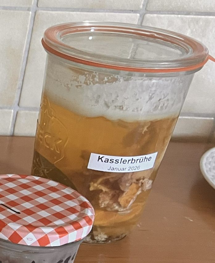 Als ich Kassler gekocht habe, hab ich aus dem Knochen eine Brühe für z.B. Erbsensuppe gekocht usw. So etwas kommt dann bis zur Verwendung ins Kellerregal.