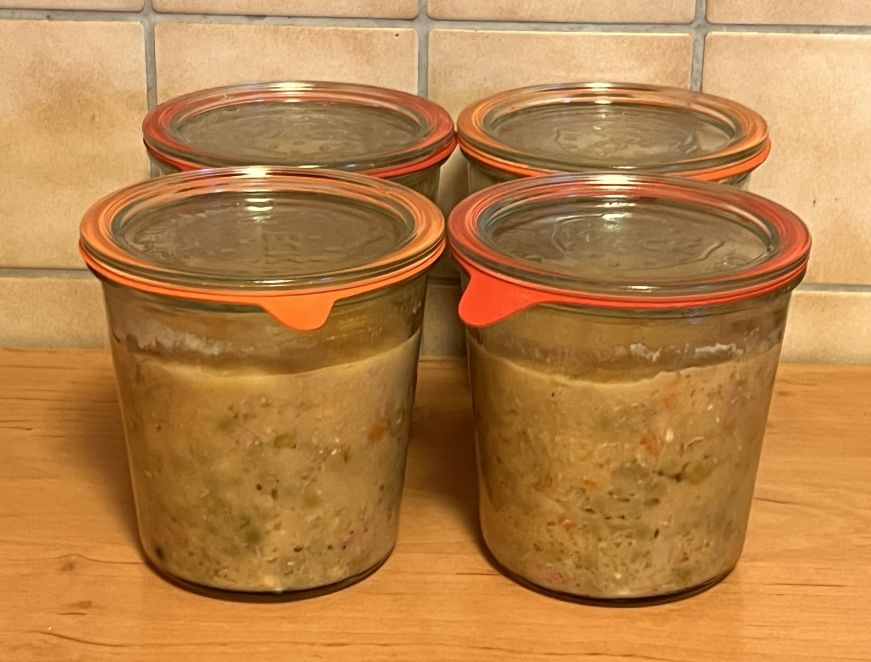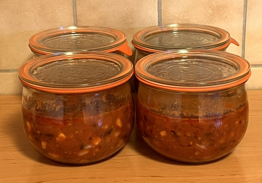 Nach und nach koche ich die Gerichte und koche sie ein. Natürlich kochen ich dann nicht nur eine oder zwei Portionen vor, sondern mindestens 4. Einmal kochen, einmal einkochen und nur noch zugreifen, wenn es gebraucht wird.