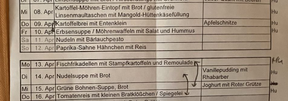 Das ist ein Auszug aus meiner Excel-Tabelle mit den Bemerkungen „Hu“ und „Ha“ „Hu“ heißt, dass der Hausherr Essen für unterwegs braucht. Das ist vor allem beim Erstellen des Plans wichtig, denn am diesen Tagen sollte das Essen transportfähig und möglichst so sein, dass man es in der Thermobox warmhalten kann.