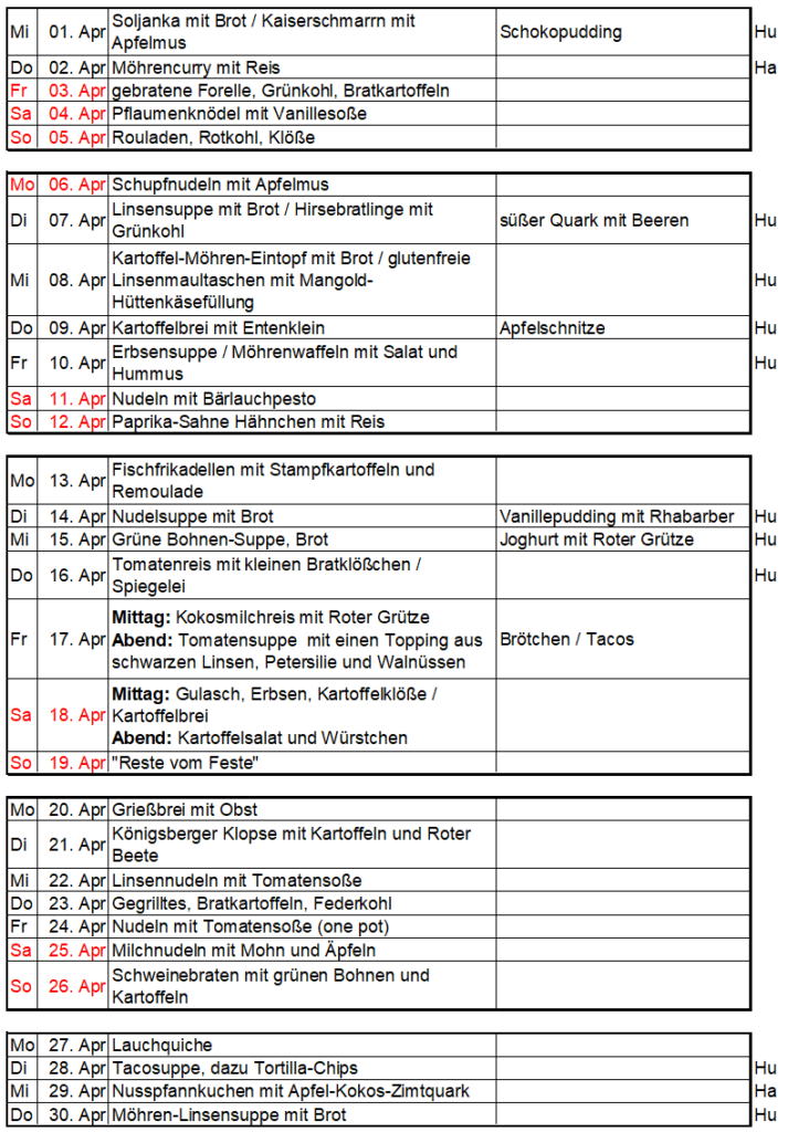 Für diesen Monat habe ich folgenden Essenplan
