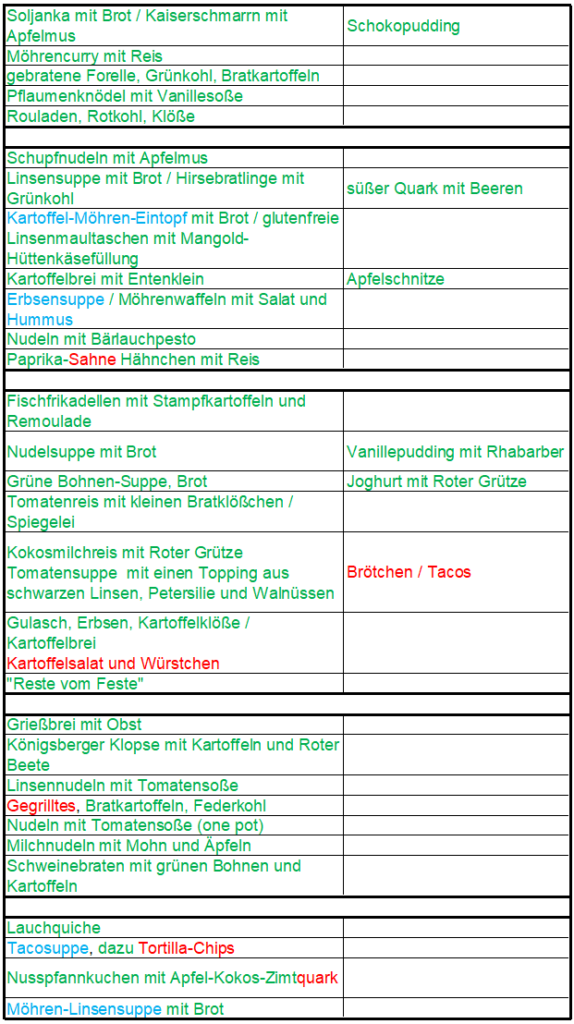 Wenn man sich anschaut, wieviel von den geplanten Essen schon vorhanden, oder zumindest die Zutaten im Haus sind (siehe der bunte Monatsplan oben), sieht man, dass ich spontan auf Veränderungen reagieren kann. Es macht mir keinen Stress, wenn etwas nicht nach Plan klappt. Wenn ein Essen heute nicht funktioniert, gibt es ein anderes.
