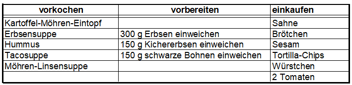 Da ich alle Zutaten, bis auf die rot markierten im Vorrat habe, kann ich die Hülsenfrüchte einweichen und dann etwas anderes erledigen.